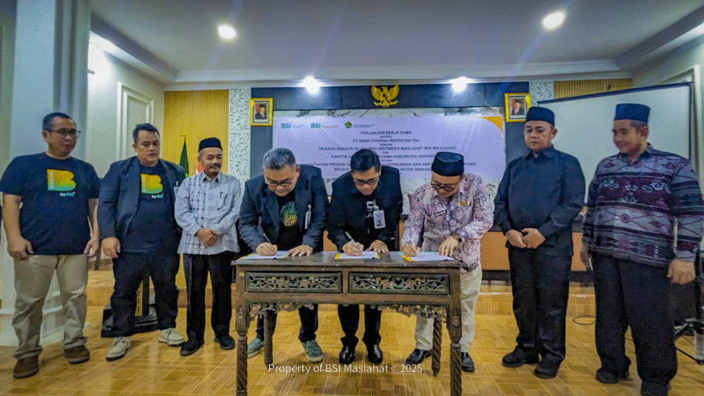 BSI Maslahat bersama PT Bank Syariah Indonesia dan Kementerian Agama (Kemenag) Kabupaten Indramayu melakukan penandatanganan komitmen kerja sama Program Wakaf Uang di Aula Kantor Kemenag Kabupaten Indramayu. Penandatanganan dilakukan oleh Kepala Kantor Kementerian Agama Kabupaten Indramayu, Dr. H. Aghuts Muhaimin, S.Pd.I., M.Ag.; Area Manager PT Bank Syariah Indonesia Area Cirebon, Deni Cahyadi; dan Direktur Waqf and Empowerment BSI Maslahat, Roni Setyabudi.
