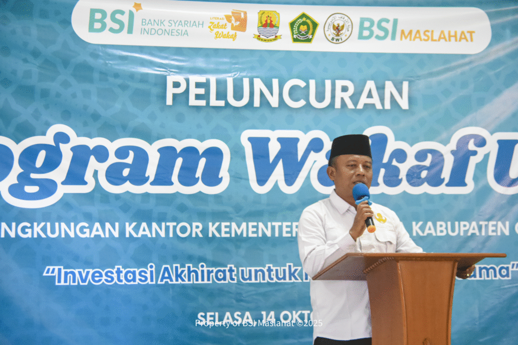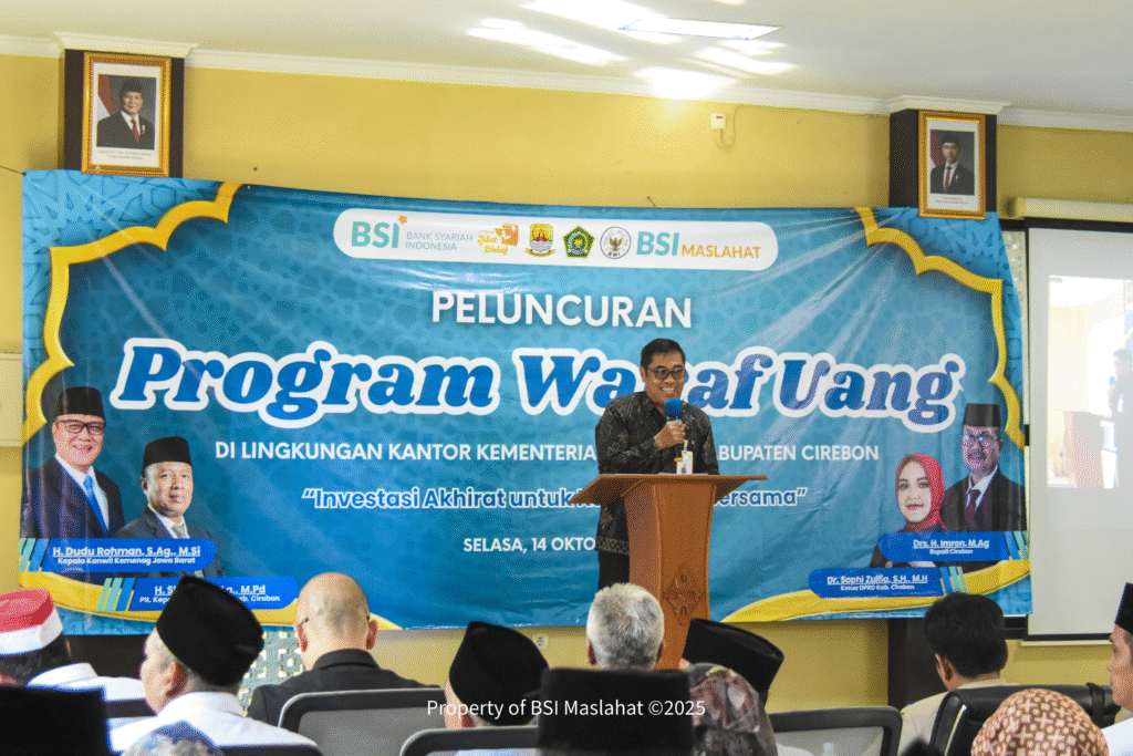 Cirebon, 14 Oktober 2025 –  BSI Maslahat bersama PT Bank Syariah Indonesia dan  Kementerian Agama (Kemenag) Kabupaten Cirebon melakukan penandatanganan komitmen kerja sama dan meresmikan program wakaf uang di Aula Haji, Kantor Kemenag Kabupaten Cirebon. Penandatanganan komitmen kerja sama dilakukan oleh Pelaksana Tugas (Plt) Kementerian Agama Kabupaten Cirebon, H. Slamet S.Ag, M.Pd; Area Manager PT Bank Syariah Indonesia Area Cirebon, Deni Cahyadi; dan Direktur Waqf and Empowerment BSI Maslahat, Roni Setyabudi.