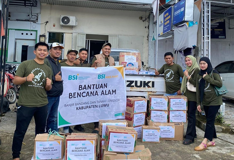PT Bank Syariah Indonesia Tbk melalui BSI Maslahat menyalurkan bantuan kepada Penyintas Banjir Bandang Luwu Sulsel. Bantuan yang diberikan meliputi air mineral, popok bayi, kebutuhan wanita, makanan siap saji dan instan, serta kebutuhan dapur umum.