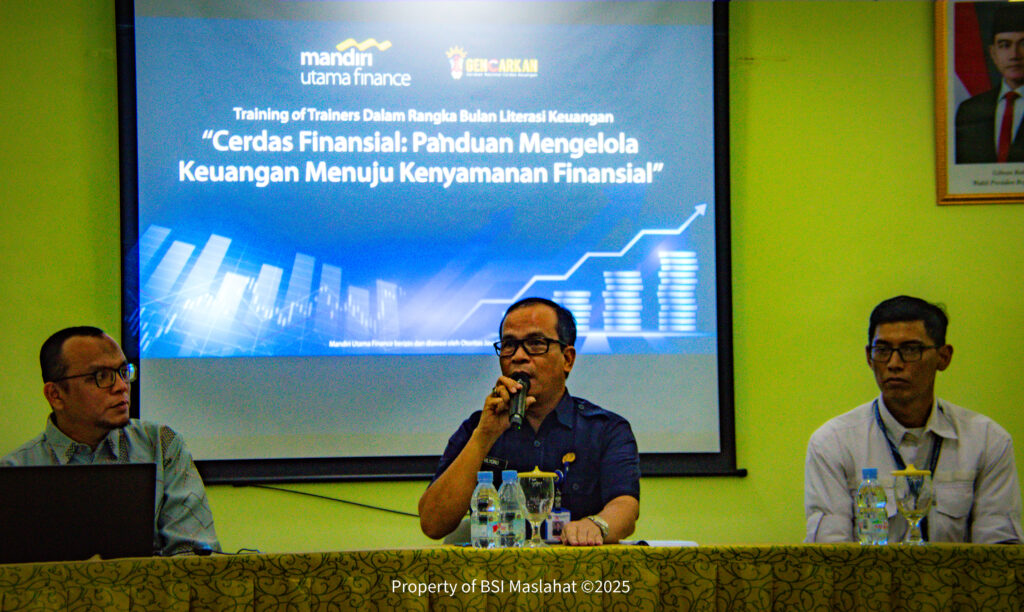 Kegiatan literasi keuangan ini mengusung tema “Training For Trainers, Cerdas Finansial : Panduan Mengelola Keuangan Menuju Kenyamanan Finansial”, kegiatan ini bertujuan untuk membekali para guru dengan pemahaman pengelolaan keuangan yang cerdas dan bijak serta fokus pada peningkatan pengetahuan finansial masyarakat, khususnya di kalangan para guru agar mereka dapat mengelola pendapatan mereka secara lebih bijak. Materi disampaikan oleh BSI Maslahat dengan topik “Membangun Edukasi Keuangan Kreatif & Berdampak” dan MUF dengan topik “Pengenalan Proses Bisnis Perusahaan Pembiayaan”