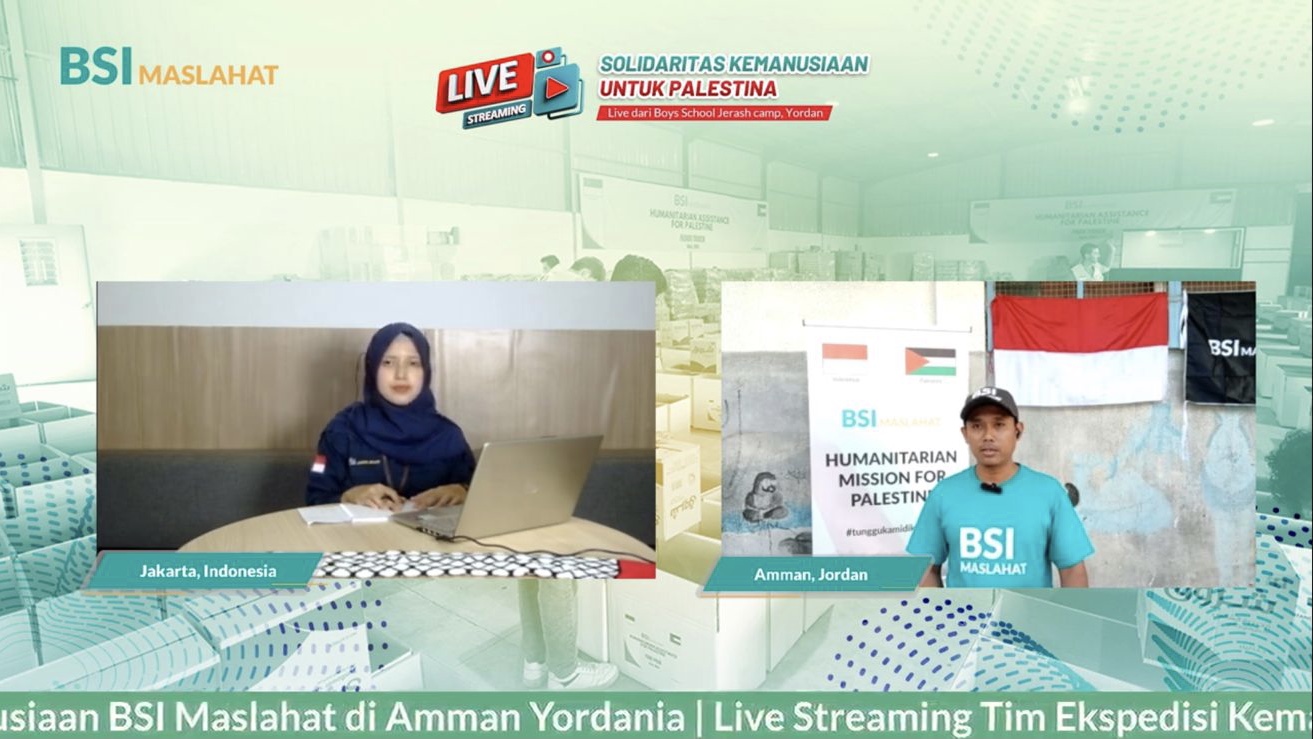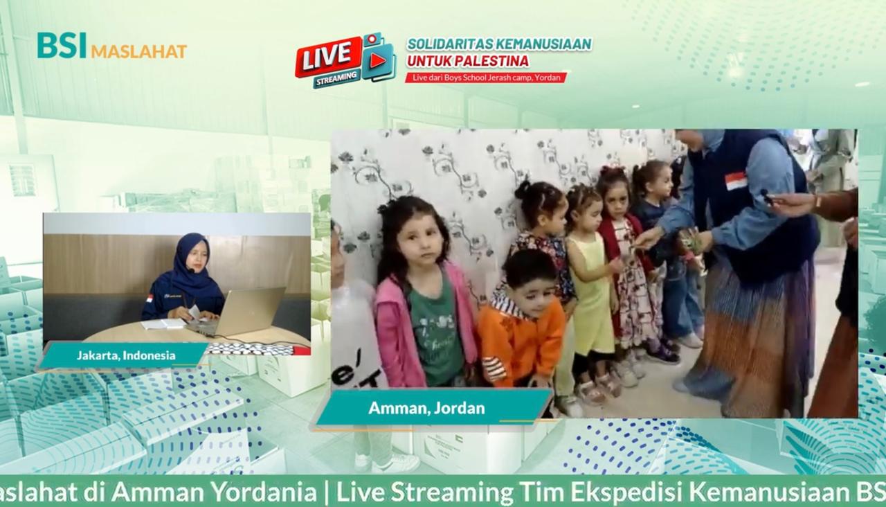 Yordania, 25 September 2024. BSI Maslahat mengadakan acara livestreaming untuk melaporkan secara langsung penyaluran bantuan kemanusiaan kepada rakyat Palestina dari lokasi pengungsian di Camp Jerrash, Amman, Jordan. Kegiatan ini bertujuan untuk menunjukkan transparansi dan akuntabilitas dalam penyaluran bantuan, serta meningkatkan kesadaran dan dukungan masyarakat Indonesia terhadap krisis kemanusiaan di Palestina.