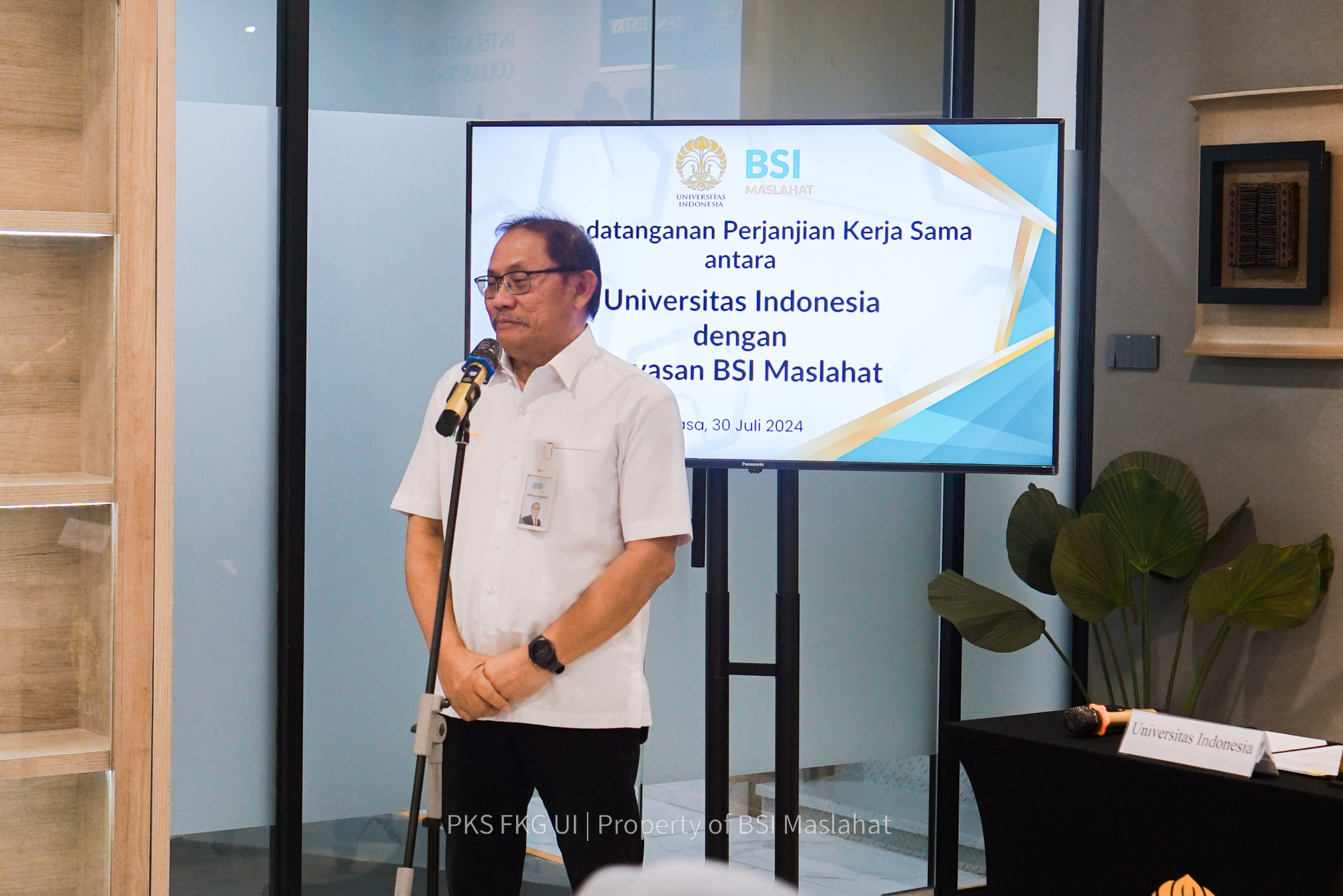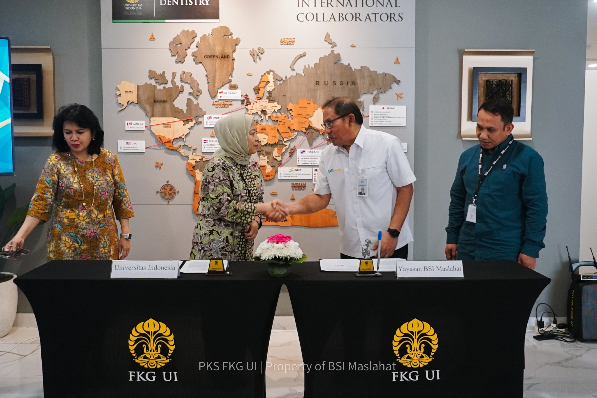 Hadir pada agenda ini Direktur Eksekutif BSI Maslahat, Sukoriyanto Saputro; Dekan FKG UI, Nia Ayu Ismaniati Noerhadi; Wakil Dekan Bidang Pendidikan, Penelitian dan Kemahasiswaan, Ria Puspitawati; dan Wakil Dekan Bidang Sumber Daya, Ventura dan Administrasi Umum, Kartini Sally.