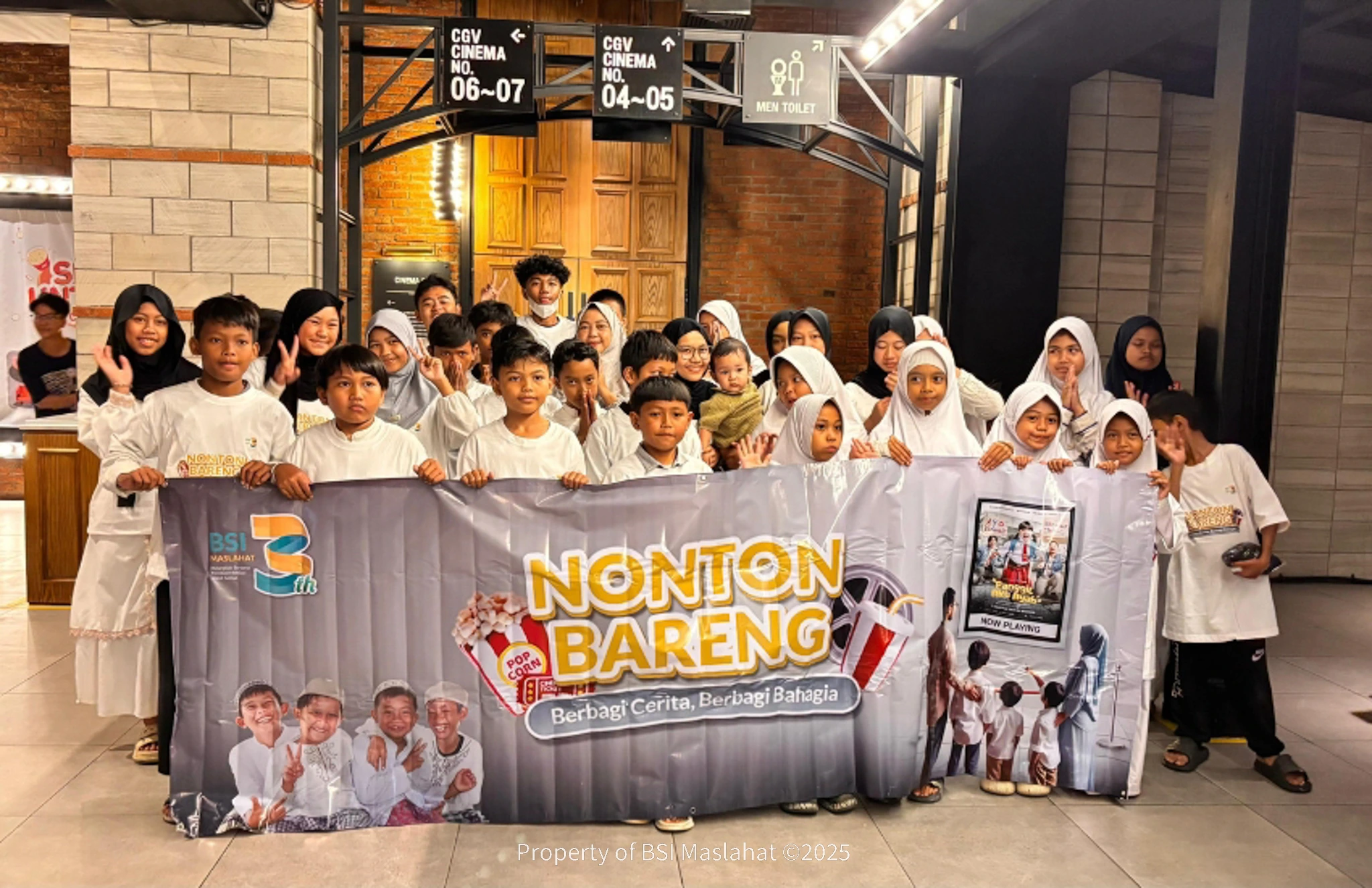 Bandung, 22 Agustus 2025 – Bangun Sejahtera Indonesia Maslahat (BSI Maslahat) bersama PT Bank Syariah Indonesia (BSI) Region 6 Bandung, menggelar kegiatan Nonton Bareng Yatim film “Panggil Aku Ayah” di CGV Cinemas, BEC Mall, Bandung pada Senin, 18 Agustus 2025. Kegiatan ini dilaksanakan dalam rangka memeriahkan milad ke-3 BSI Maslahat yang dihadiri oleh 33 anak yatim.