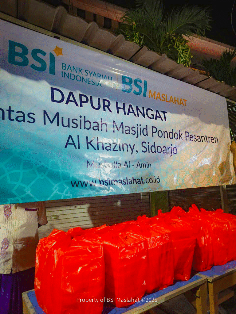 Sebagai bentuk kepedulian terhadap para korban dan keluarga yang terdampak, BSI Maslahat menyalurkan bantuan kemanusiaan senilai Rp150Juta kepada pihak Ponpes Al Khoziny. Dana tersebut digunakan mendukung proses pemulihan pasca tragedi dan penyediaan Dapur Hangat di sekitar lokasi kejadian. Dapur hangat ini menyediakan makanan dan minuman hangat bagi keluarga terdampak dan para relawan yang terlibat dalam proses evakuasi.