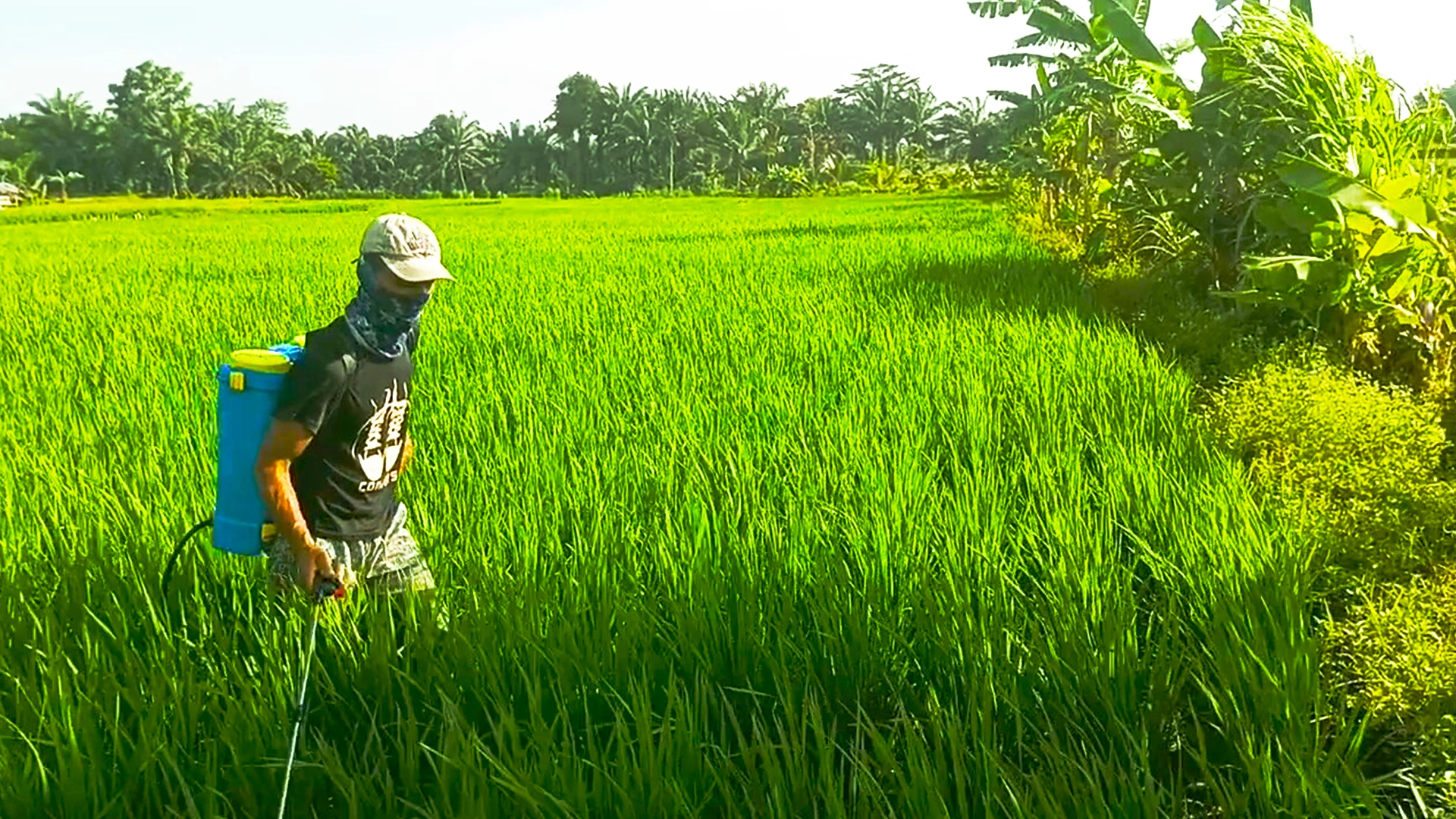 Aplikasi Biopestisida atau pestisida organik hasil pelatihan pertanian organik dengan tidak menggunakan bahan kimia untuk mencegah hama tanaman padi.