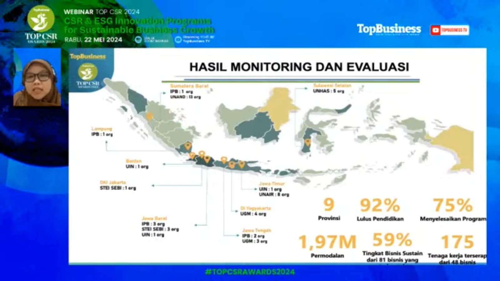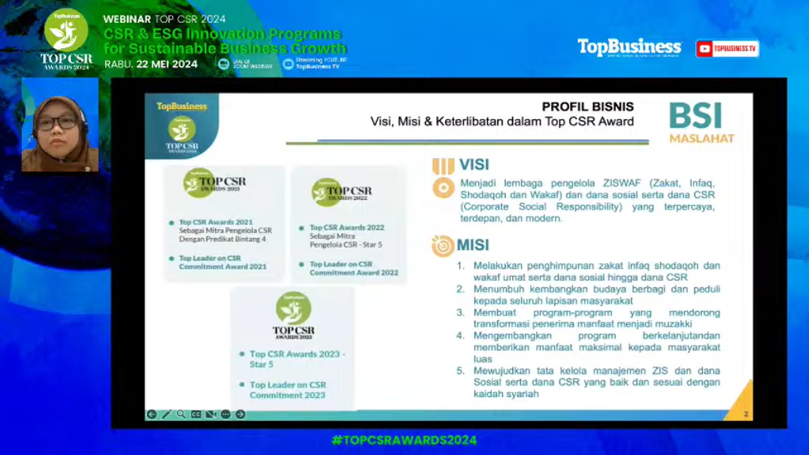 BSI Maslahat berpartisipasi pada webinar penjurian pada ajang TOP CSR Awards 2024 dengan tema “CSR Innovation Programs for Sustainable Business Growth” pada Rabu, 22 Mei 2024. Webinar ini diselenggarakan oleh Majalah Top Business tahun 2024. Webinar TOP CSR Awards 2024 ini merupakan kegiatan yang diadakan sebelum acara puncak penghargaan TOP CSR Award 2024 pada Rabu, 29 Mei 2024 mendatang.